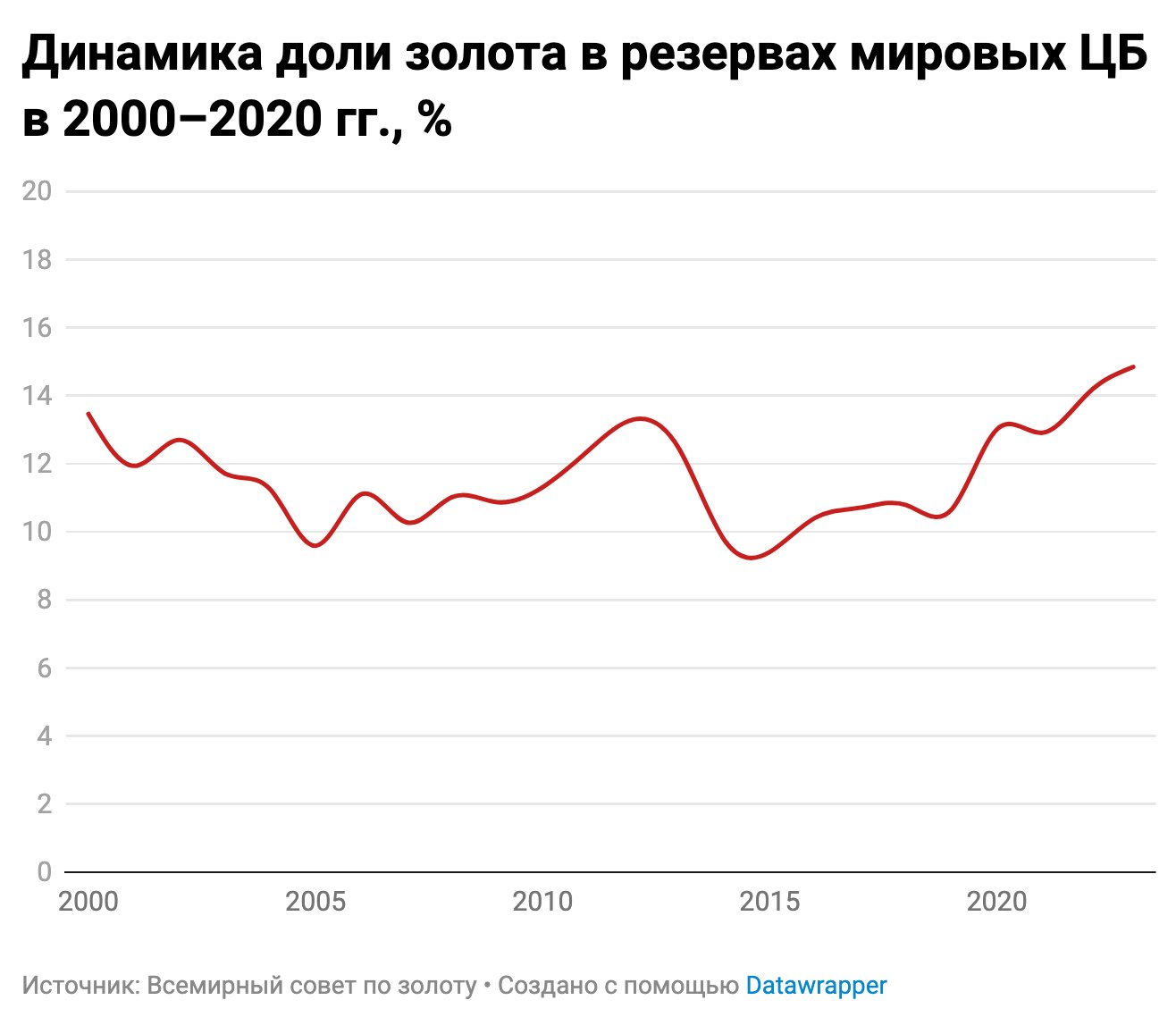 Учитывая отмеченные выше риски развития мировой экономики, в последние годы в структуре международных резервов растет доля золота (см. график 4). В 2022 г. объем нетто-покупок золота центральными банками достиг максимального значения с 2000 г. (см. график 5). Золото является активом, способным хеджировать экономические и геополитические риски. Доходность золота слабо коррелирует с доходностью финансовых инструментов, что делает его уникальным защитным активом. Золото позволяет сгладить потери в случае реализации экономических рисков, когда большинство других активов значительно теряет в стоимости. Именно поэтому спрос на золото для аккумулирования резервов растет в кризисные периоды. В этом смысле оно является аналогом и некоторой альтернативой доллару.